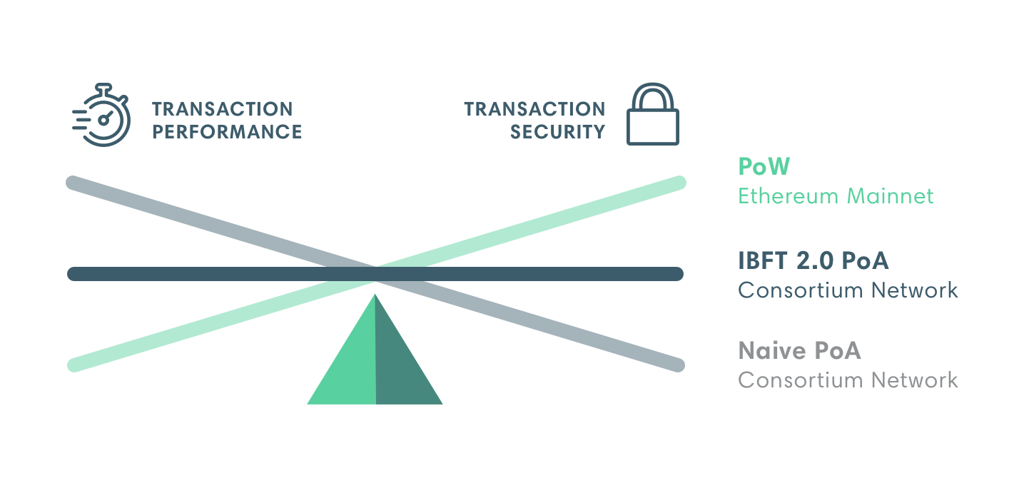 With consensus algorithms, there's a tradeoff between transaction security and performance. Performance in blockchains is generally measured in transaction throughput. At one end, the Ethereum mainnet using PoW offers great security but low performance. At the other end, consortium blockchain solutions using earlier PoA algorithms offer high performance with little or no security.