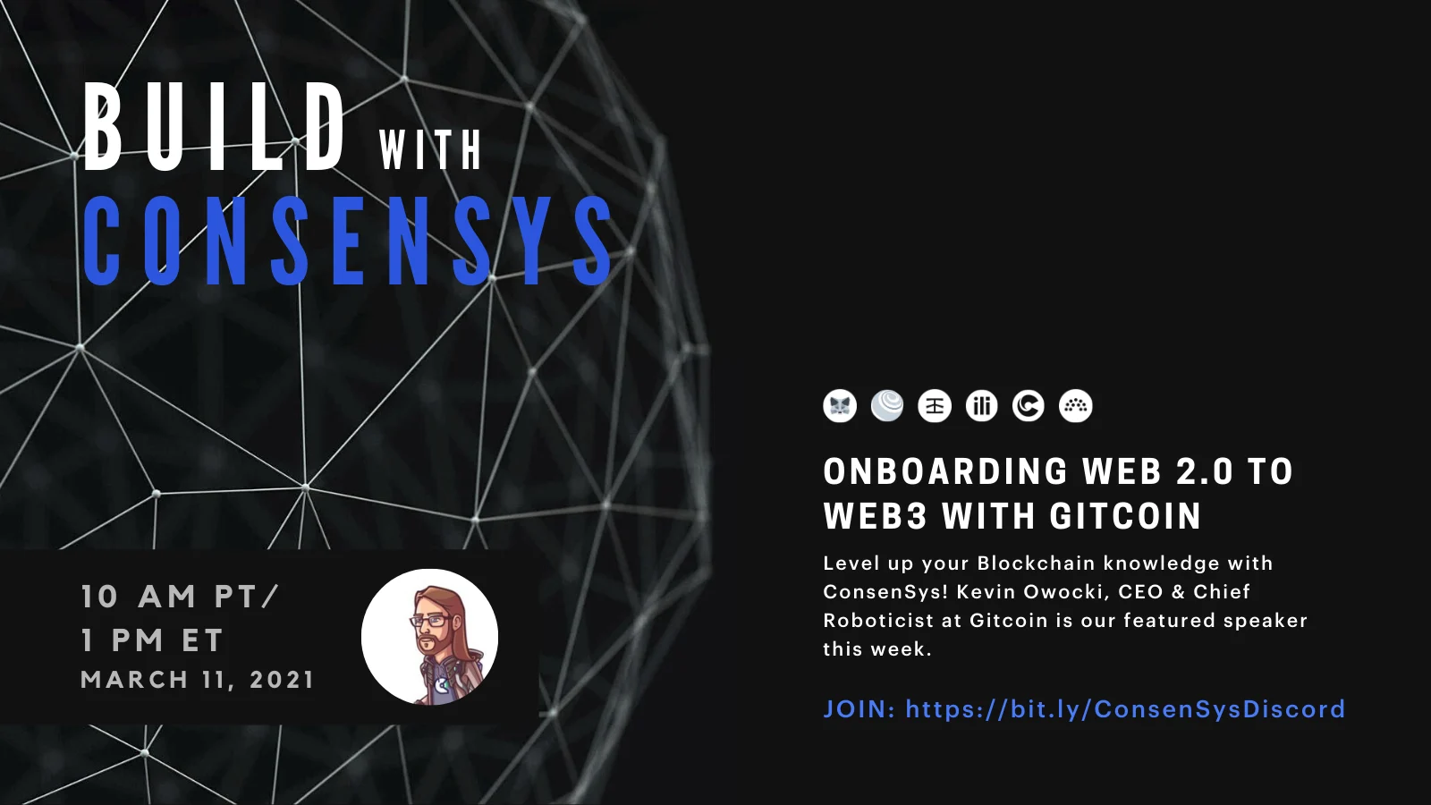 Join us for another "Build with Consensys" weekly Discord session this Thursday, March 11 @ 10am PT/1pm ET! This week, we have invited Kevin Owocki, CEO & Chief Roboticist for Gitcoin, for a technical discussion on bringing traditional web developers into the Ethereum space with bounties, grants and quadratic voting.