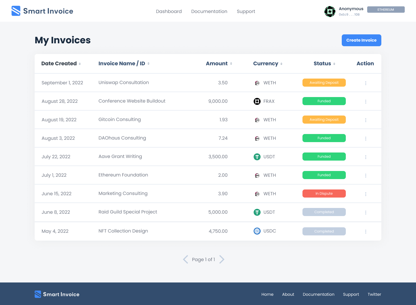 The client’s dashboard will show all invoices assigned to their wallet address.